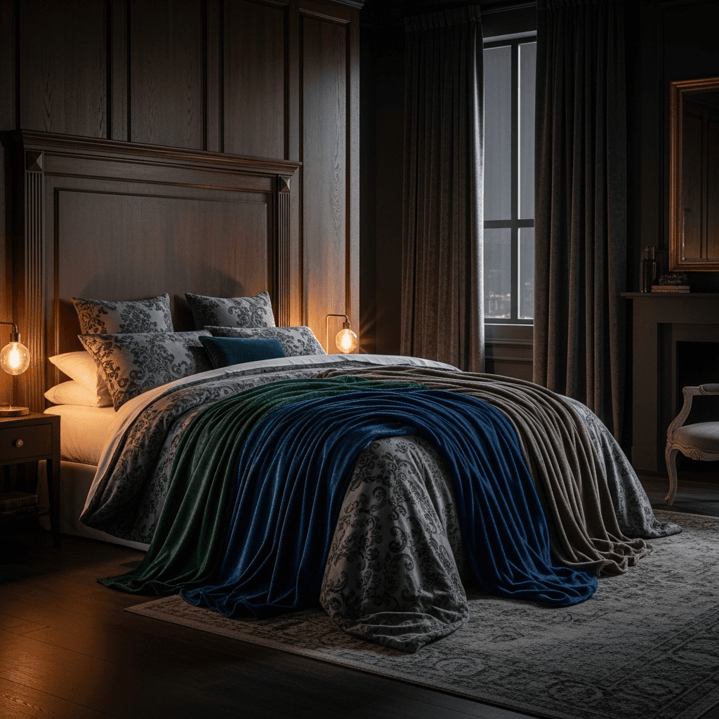 Use thick, patterned fabrics for the bedding to lean into a maximalist moody vibe. These heavy textures absorb light and add a sense of history to the room.