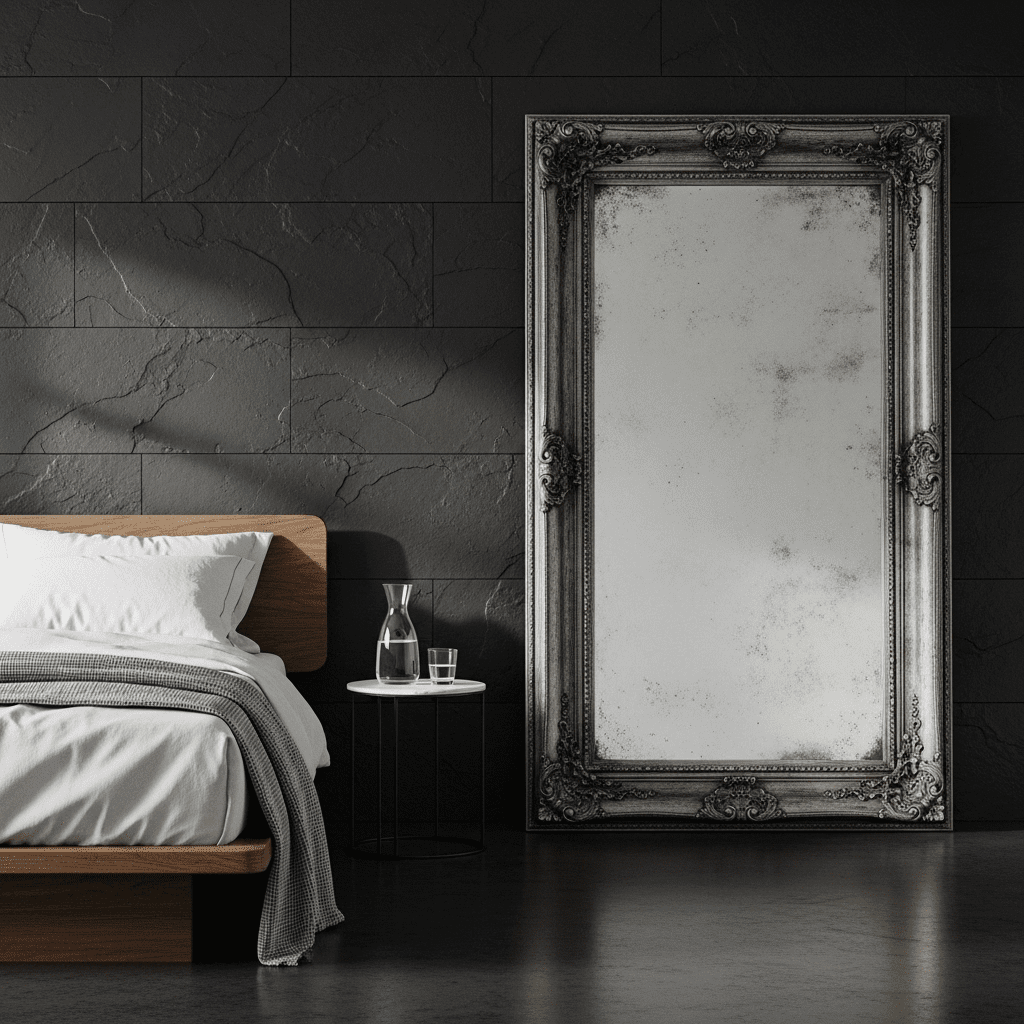 Using antiqued or “smoky” mirrors adds a reflective quality that still feels dark. It provides depth and mystery to the walls without the brightness of a standard mirror.