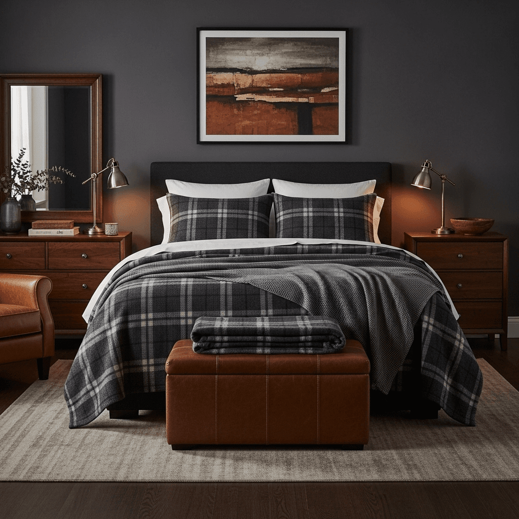 Incorporate dark plaid or tartan in graphite and black for a masculine, moody look. It adds a traditional, “gentleman’s club” feel to the guest experience.