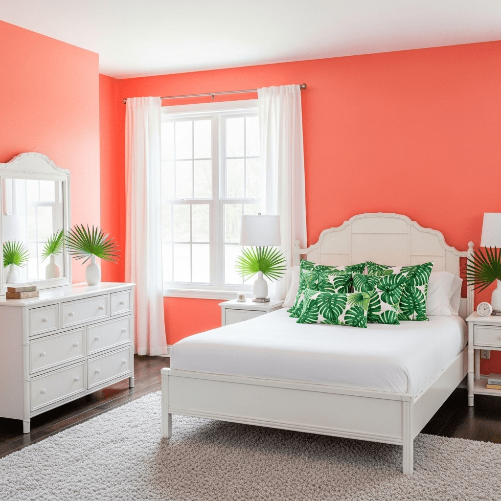 Combine vibrant coral pink with crisp white and leafy green accents. This high-energy palette feels like a permanent tropical vacation, perfect for a bright and cheery guest stay.