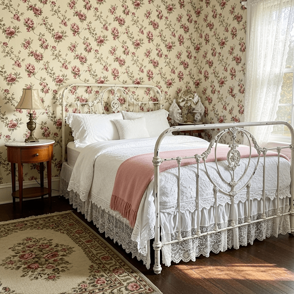 Embrace a nostalgic aesthetic with “cabbage rose” wallpaper or floral chintz. This traditional look feels cozy and storied, especially when paired with antique white furniture.