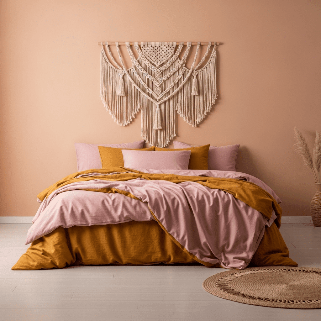 Mix pink with orange and yellow to create a “sunset” palette. Use macramé wall hangings and textured rugs to emphasize a relaxed, free-spirited bohemian vibe.