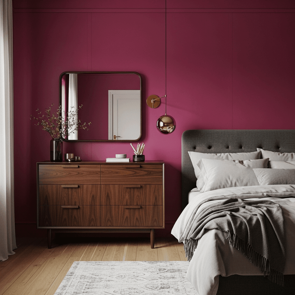 For a bold guest room, use a saturated raspberry or fuchsia. This “jewel-tone” pink looks stunning under warm evening lighting and pairs beautifully with dark walnut wood.