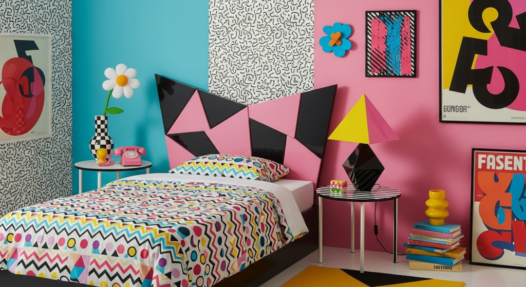 The 80s post modern interior design bedroom rejected modernist minimalism for playful experimentation and ironic references. Memphis Milano aesthetic epitomized postmodernism with squiggly patterns, asymmetrical forms, and unexpected color combinations—turquoise with pink, yellow with purple. Furniture featured unusual proportions and decorative elements purely for visual interest rather than function. Bedrooms became artistic statements incorporating sculptural furniture, bold graphics, and whimsical accessories. This avant-garde approach influenced mainstream design, making even conservative spaces bolder and more colorful during this revolutionary design decade.