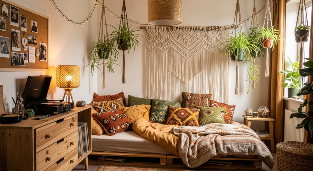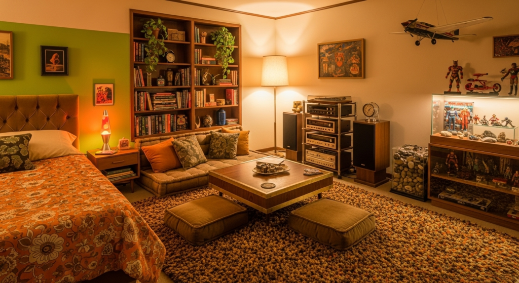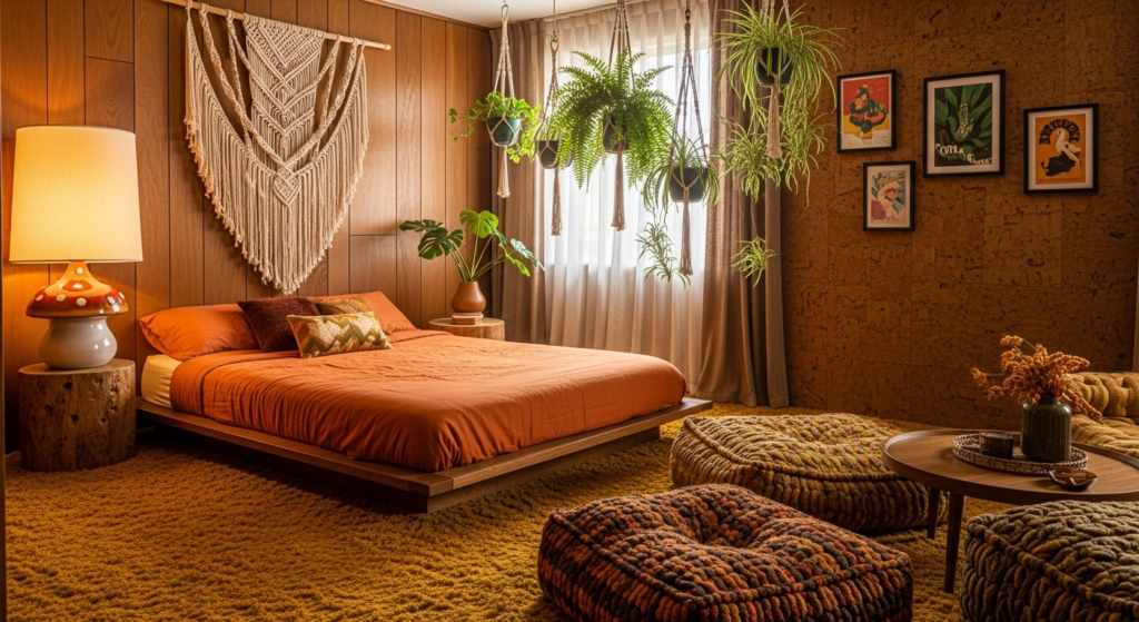The 70s aesthetic interior design bedroom captures the decade’s distinctive vibe through specific design elements and styling choices. Key aesthetics include the bohemian earth-child look with natural fibers, plants, and handcrafted elements; the disco-glam style with metallics, mirrors, and luxurious fabrics; and the back-to-nature movement featuring raw wood, stone, and organic shapes. Bedrooms embraced eclecticism, mixing grandma’s antique dresser with mod plastic furniture and ethnic textiles. The overall aesthetic prioritized comfort, warmth, and personality over coordinated perfection, creating spaces that felt lived-in and authentic.