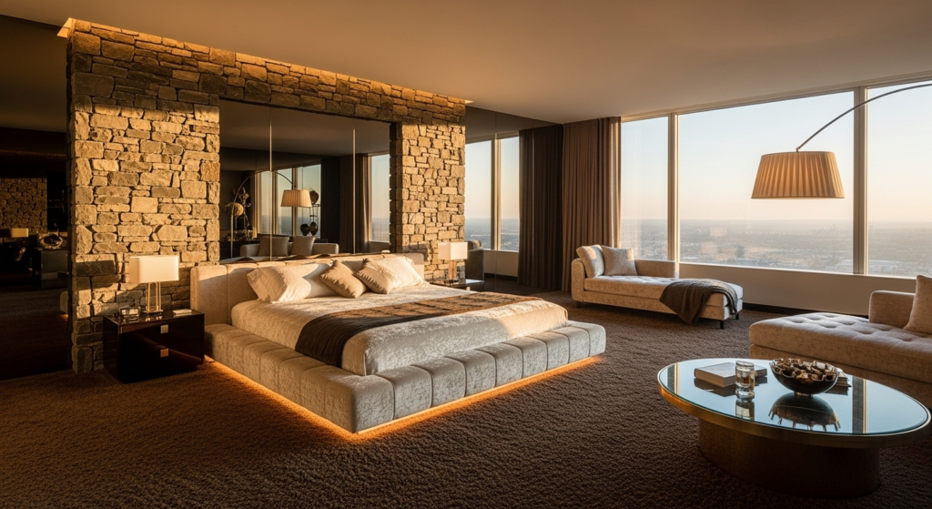 The 70s luxury interior bedroom elevated the decade’s signature elements through premium materials and sophisticated execution. Wealthy homeowners installed custom platform beds with integrated sound systems and lighting, employed interior designers who coordinated every detail, and invested in high-end furnishings from prestigious makers. Luxury bedrooms featured sunken sleeping areas with multiple levels, floor-to-ceiling windows with panoramic views, and architectural details like exposed stone walls or brick. Rich velvets, suedes, and furs created tactile luxury, while mirrored walls and ceilings expanded spaces and added glamour.