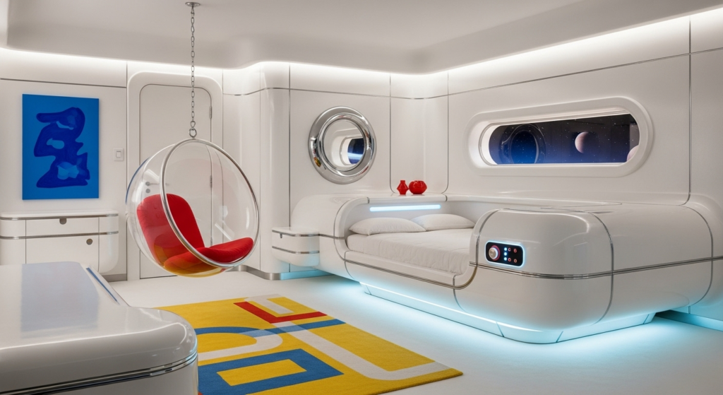 The 70s space age interior bedroom continued 60s futuristic themes with more refined execution. Influenced by actual space exploration achievements, bedrooms incorporated pod-like furniture, spherical hanging chairs, and curved walls. White, silver, and primary colors created futuristic palettes, while molded plastic and fiberglass furniture resembled spacecraft interiors. Built-in electronics, intercom systems, and experimental lighting created high-tech environments. Though less common than earth-toned bohemian styles, space-age bedrooms represented progressive design thinking and optimistic technological futures, often appearing in modernist homes and apartments.