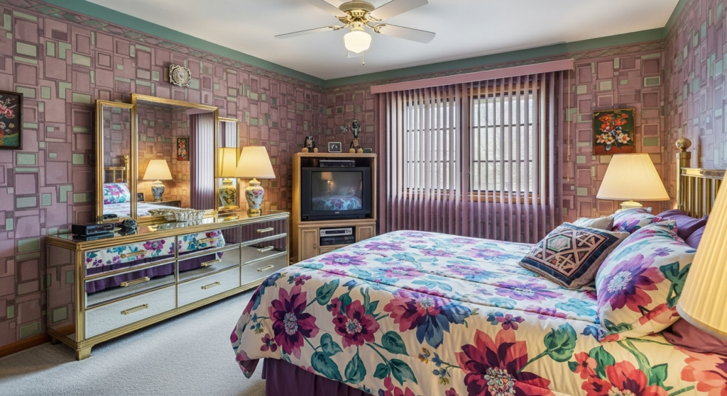 The bedroom interior 80s exploded with bold colors, geometric patterns, and glamorous excess. Pastel palettes—mauve, dusty rose, seafoam green, and peach—dominated early-to-mid 80s, while jewel tones and metallics emerged later. Mirrored furniture, glass-brick walls, and brass accents brought shine and reflection. Oversized furniture with rounded edges, modular storage systems, and entertainment centers designed for VCRs and stereos characterized the decade. Vertical blinds replaced heavy drapes, while ceiling fans with light kits became standard. Pattern mixing reached extremes with floral bedding, geometric wallpaper, and animal-print accents coexisting boldly.