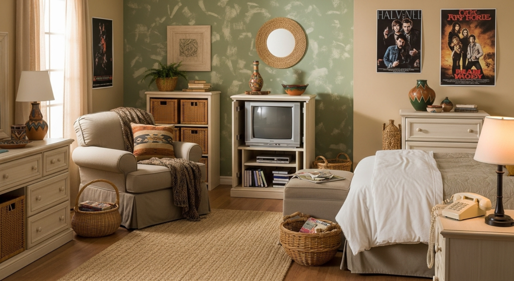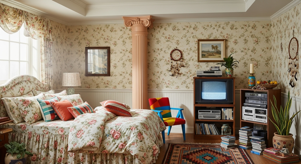 The 80s bedroom interior design embraced postmodern eclecticism with fearless style combinations. Designers mixed high and low, traditional and contemporary, creating unexpected juxtaposes. Southwestern influences appeared through Santa Fe-style furniture, cactus motifs, and terracotta accents. Laura Ashley florals competed with Memphis Milano geometric boldness. Bedrooms featured architectural elements like columns, arches, and tray ceilings with dramatic paint treatments. Ruffles adorned everything from bed skirts to lampshades, while chintz fabrics brought traditional patterns into modern contexts. Technology became visible with TVs, VCRs, and stereo systems prominently displayed rather than hidden.