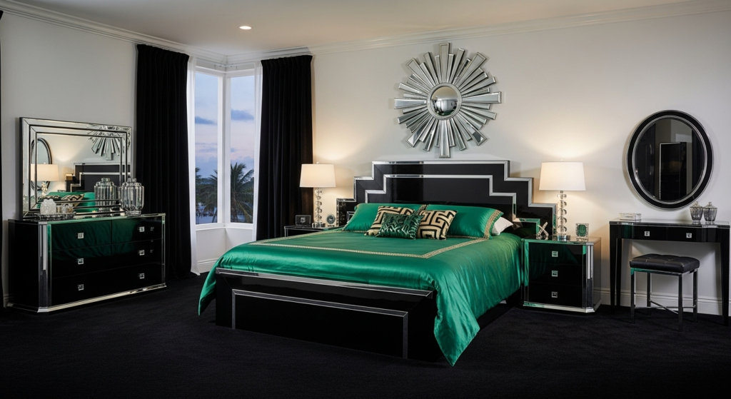The bedroom interior 1930s represents the height of Art Deco elegance and Hollywood Regency glamour. This era embraced luxury despite economic challenges, with streamlined furniture featuring waterfall edges, exotic wood veneers like mahogany and walnut, and geometric patterns. Bedrooms showcased mirrored furniture, sunburst motifs, and chrome accents. Color palettes included dusty rose, peacock blue, cream, and mint green. Curved headboards, tufted upholstery, and symmetrical arrangements defined the sophisticated 1930s aesthetic. Lighting fixtures featured stepped designs and frosted glass, while textiles incorporated bold geometric patterns and luxurious materials like silk and velvet.