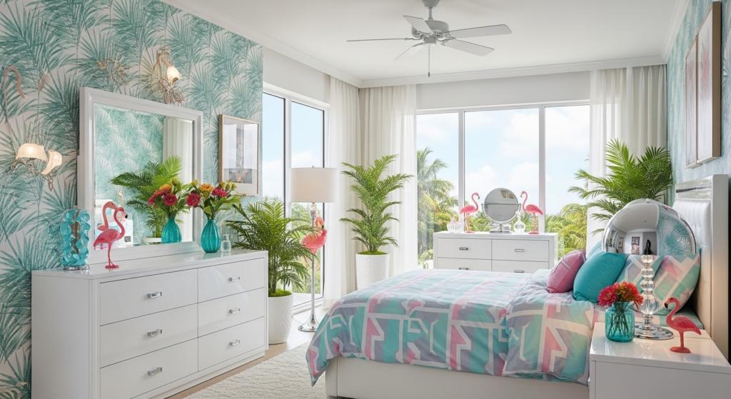 The miami 80s interior bedroom captured South Beach glamour through specific color palettes and tropical influences. Pastel schemes—particularly pink, turquoise, and yellow—created the iconic Miami Vice aesthetic. White lacquer furniture, glass tables, and chrome accents brought sleek sophistication. Tropical elements included palm frond prints, flamingo motifs, and rattan accents. Bedrooms featured floor-to-ceiling windows with ocean views (or the aspiration thereof), ceiling fans for subtropical climate comfort, and outdoor access to balconies or terraces. This sun-soaked aesthetic influenced popular culture and represented aspirational luxury lifestyle during the decade.