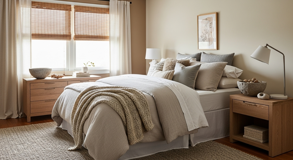The 90s decor interior design bedroom featured specific decorative elements defining the decade’s aesthetic. Window treatments simplified to cellular shades, Roman blinds, or bamboo blinds replacing heavy drapes. Bedding became layered with multiple pillows in varying sizes and a focus on texture rather than busy patterns. Area rugs replaced wall-to-wall carpeting as wood floors became desirable. Decorative bowls, vases, and accessories in natural materials like stone, wood, and ceramic created organic displays. The decade popularized the “less is more” philosophy, though rooms still felt warm and inviting rather than stark. This represented a thoughtful curation rather than minimalist severity.