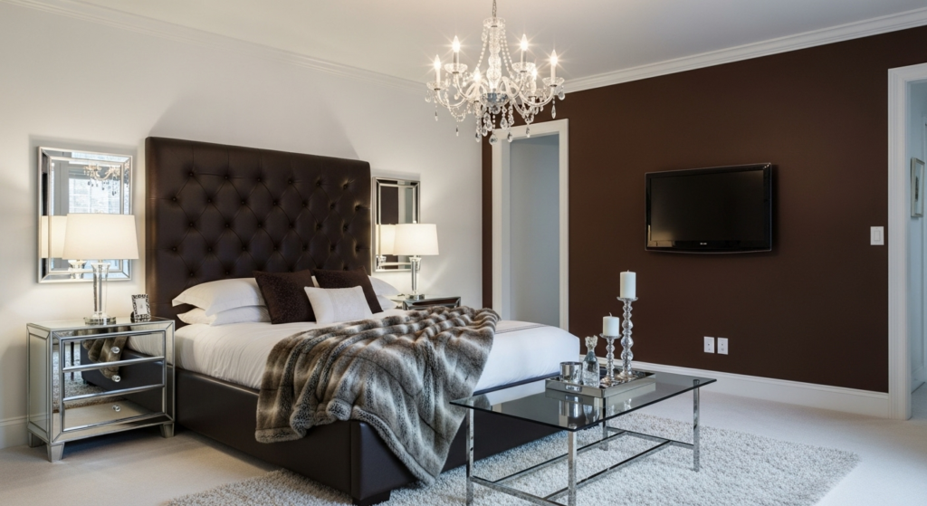 The bedroom interior 2000s ushered in millennium modern aesthetics with clean lines, contemporary furniture, and technology integration. Flat-screen TVs replaced bulky entertainment centers, mounted on walls or placed on sleek low-profile stands. White became dominant, often paired with chocolate brown, black, or bold accent colors. Bedrooms featured tufted leather or velvet headboards, mirrored or metallic accent furniture, and glass elements. Home theater systems, surround sound, and gaming setups influenced room layouts. The decade embraced both minimalist modernism and glamorous touches like crystal chandeliers and faux fur throws. HGTV culture influenced design awareness, making sophisticated contemporary design more accessible.