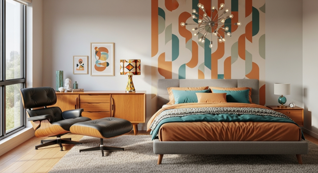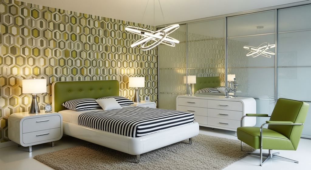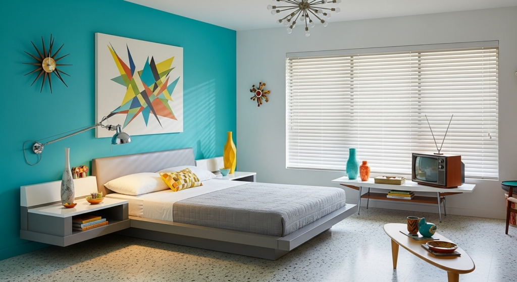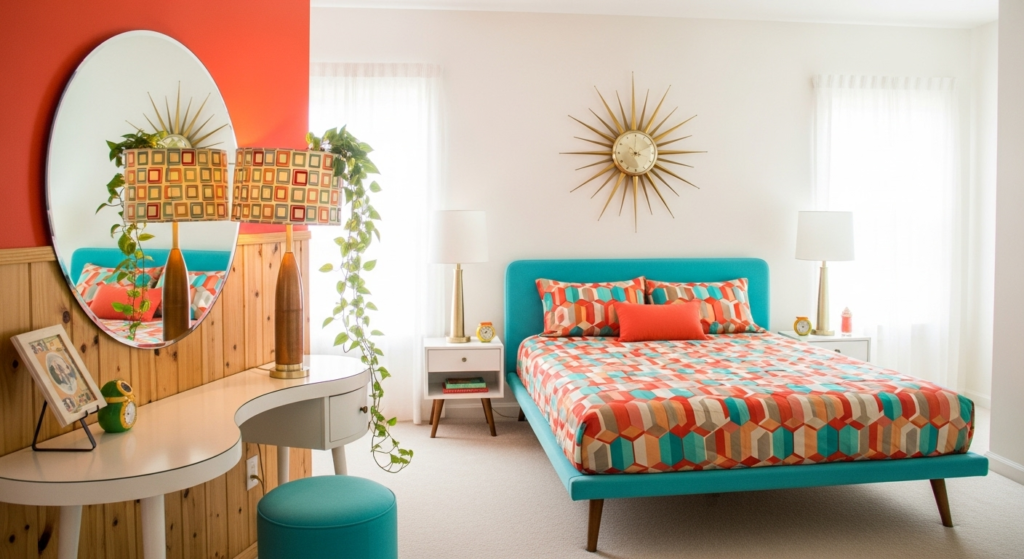 The 60s bedroom interior design showcased technological optimism through space-age materials and futuristic forms. Molded fiberglass furniture, acrylic accessories, and vinyl upholstery represented modern materials. Chrome and glass coffee tables brought living room sophistication to bedroom sitting areas. Geometric patterns—circles, hexagons, and Op Art designs—adorned wallpapers and textiles. Sliding closet doors with geometric cutouts or frosted glass panels became architectural features. Built-in storage systems maximized efficiency, reflecting the decade’s fascination with streamlined living and modernist principles.