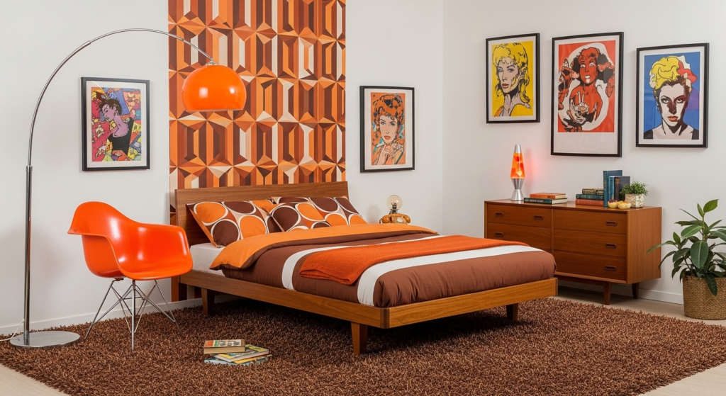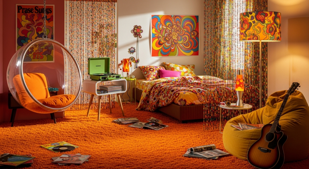 The 60s bedroom interior celebrated freedom and creativity with unconventional furniture arrangements and bold design choices. Sunken conversation areas occasionally extended into bedroom spaces in progressive homes. Egg chairs, bubble chairs, and bean bags provided alternative seating. Wall-to-wall carpeting in bold colors replaced traditional rugs, while room dividers created flexible spaces. Bedrooms incorporated entertainment centers for record players, and posters replaced traditional artwork. The decade’s youth-driven culture transformed bedrooms into personal expression spaces rather than merely functional sleeping areas.