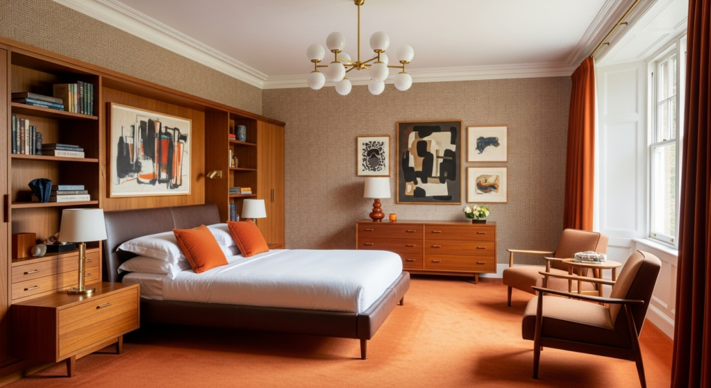 The 60s luxury interior bedroom combined mid-century elegance with opulent materials and sophisticated palettes. Wealthy homeowners embraced designer furniture from makers like Knoll and Herman Miller, featuring rich woods, leather upholstery, and brass accents. Luxury bedrooms included custom built-ins, statement lighting fixtures, and carefully curated art collections. Color schemes moved beyond bright pop colors to sophisticated combinations like chocolate brown with burnt orange, or navy with gold. Textured wall coverings, thick pile carpeting, and floor-to-ceiling draperies added richness while maintaining the decade’s modern aesthetic.