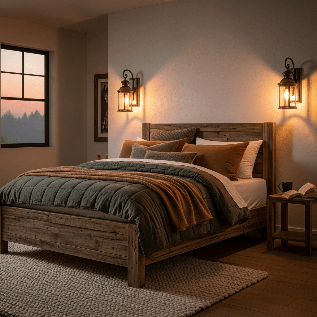 Use lighting that mimics the warm, flickering glow of a campfire or lantern. Choose Edison-style bulbs and copper or bronze fixtures to create a soft, inviting evening atmosphere.