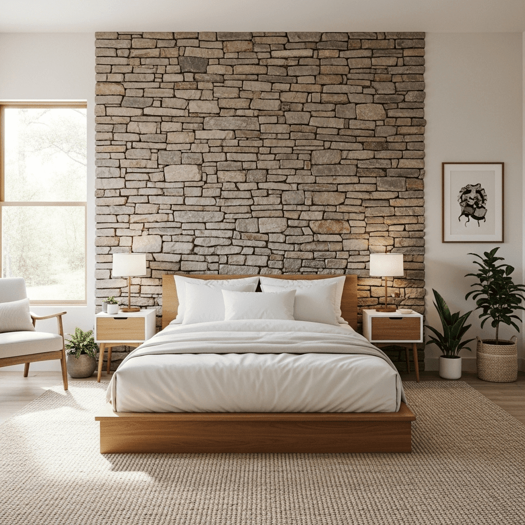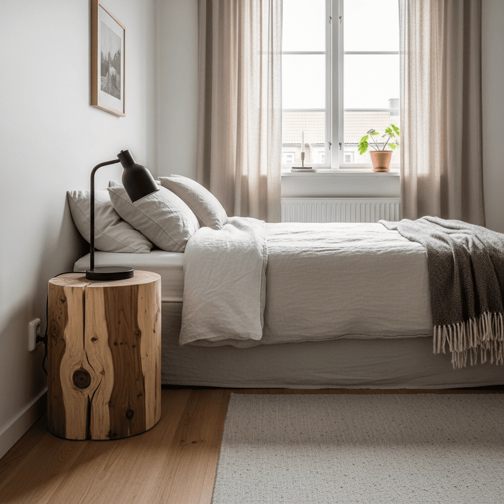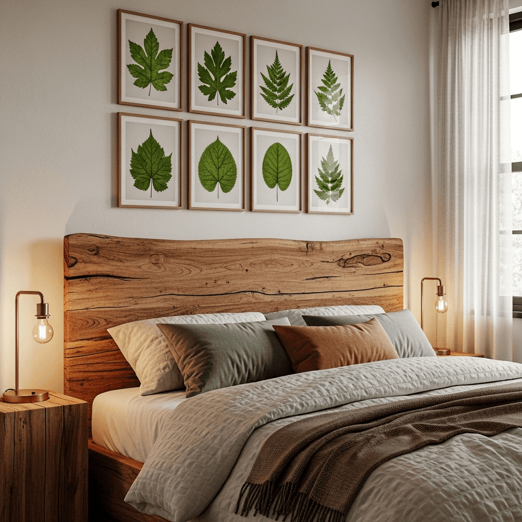 Bring the forest floor to the bedside by using polished tree stumps or “live-edge” wood slices as nightstands. Each piece is unique, adding an artisanal, one-of-a-kind feel to the room.