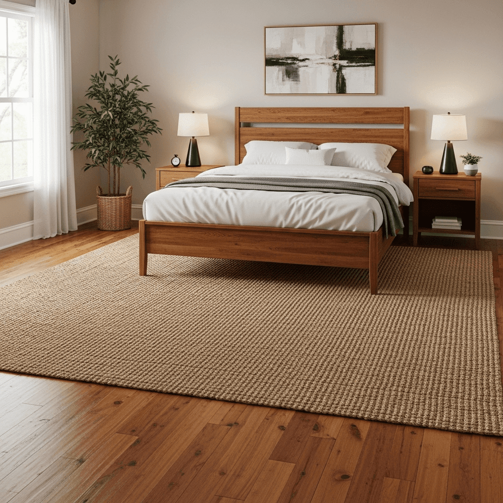 A large jute or sisal rug adds a layer of raw, natural fiber underfoot. Its chunky weave is durable and provides a “coastal-rustic” texture that feels great in any season.