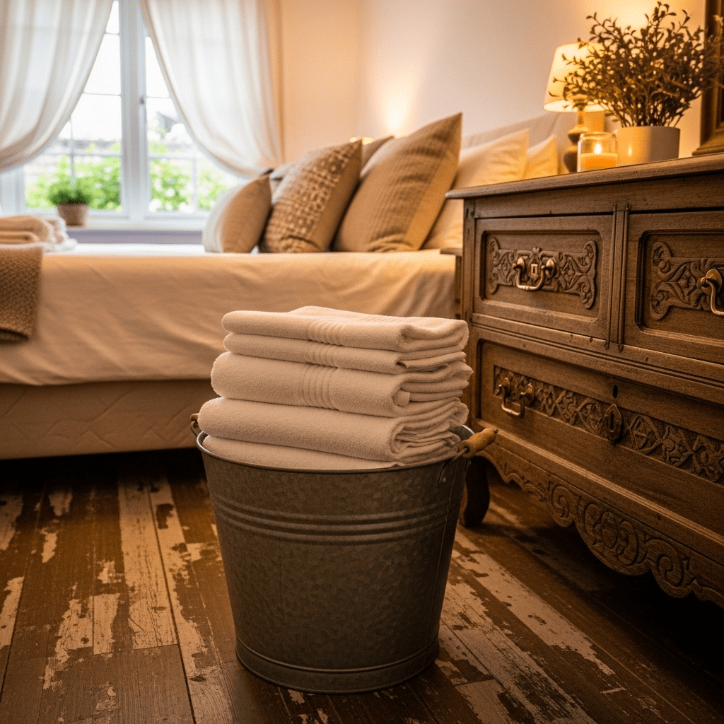 Use galvanized metal bins or buckets for storage—perhaps to hold extra towels or firewood. The cool, industrial silver of the metal provides a beautiful contrast to warm wood tones.