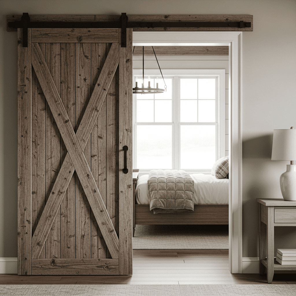 Replace a standard swinging door with a heavy wooden barn door on a black metal track. It’s a functional space-saver that reinforces the rustic theme from the moment guests enter.