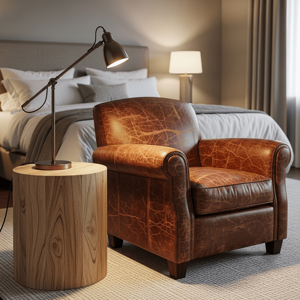 Place a well-worn leather armchair in the corner. The natural “patina” and scuffs of the leather only add to the room’s character, offering guests a cozy spot to read and relax.