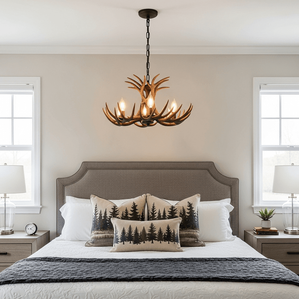 A chandelier or bedside lamp made from shed antlers (or high-quality faux versions) acts as a sculptural focal point. It’s a signature rustic detail that brings a touch of the forest indoors.
