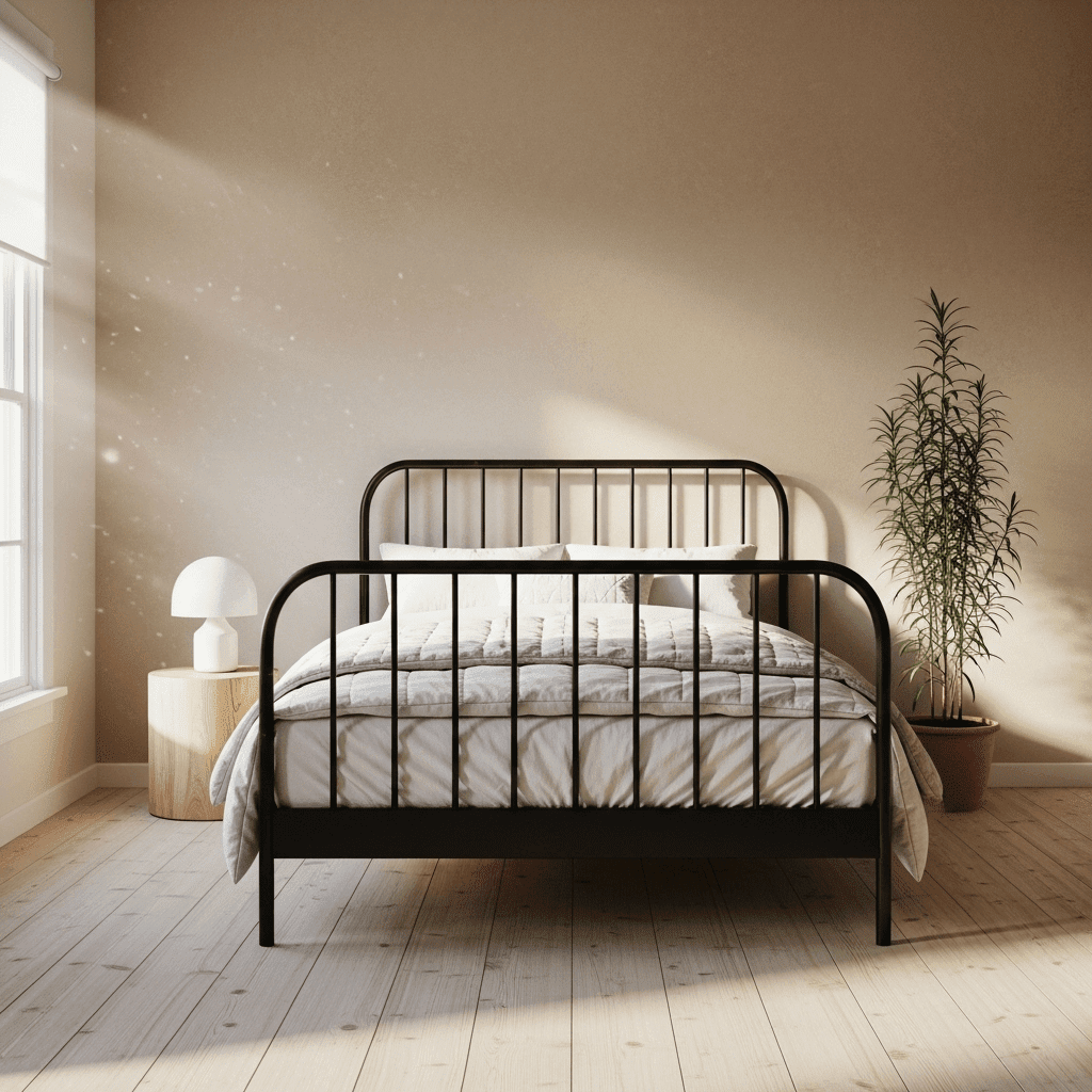 A black wrought iron bed frame offers a classic, sturdy silhouette. Its open design prevents a rustic room from feeling too “heavy” while providing a vintage, handcrafted look that lasts generations.