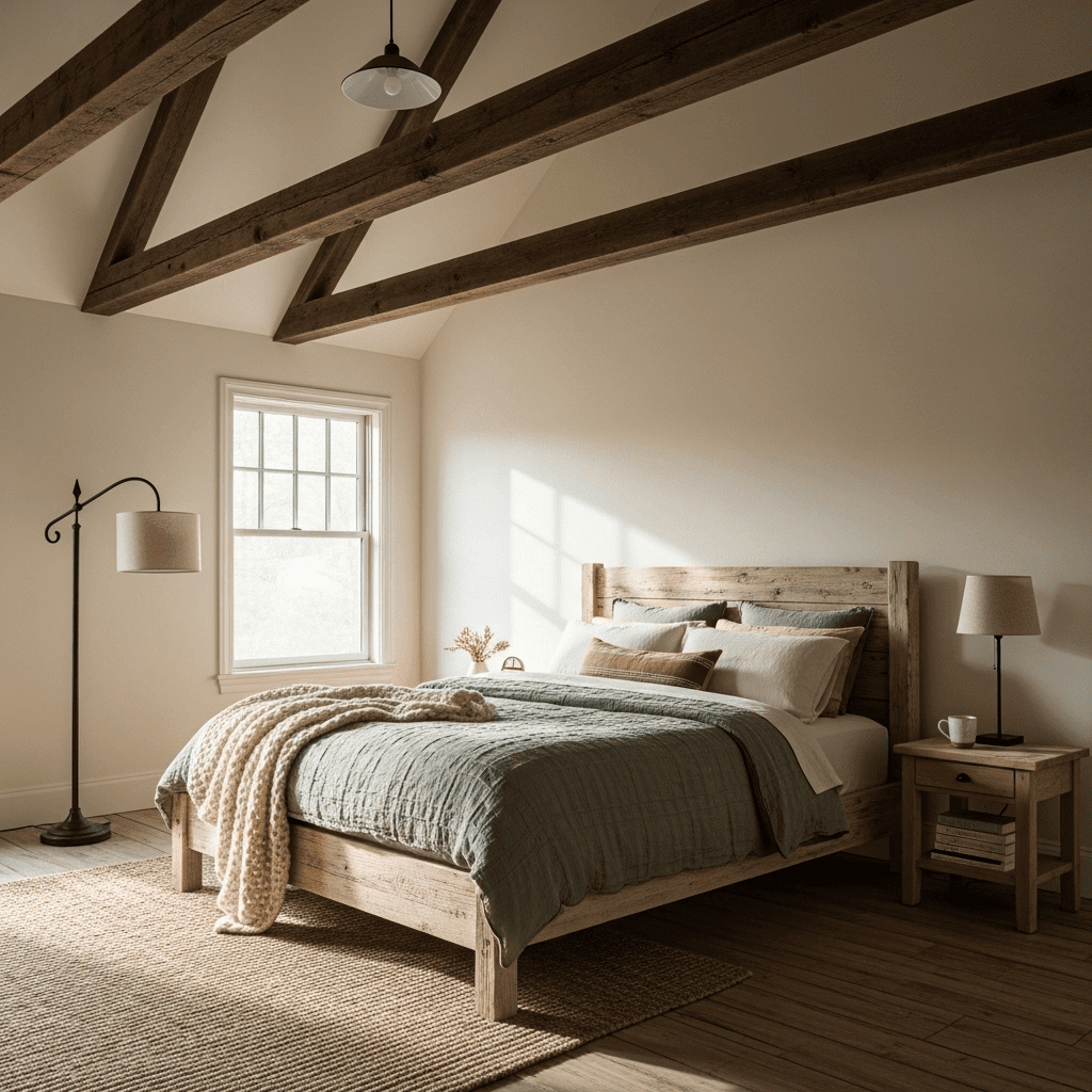 Install a wall of weathered, reclaimed timber behind the bed. The varied wood grains and natural distress provide an immediate sense of history and organic warmth that serves as the room’s primary art piece.