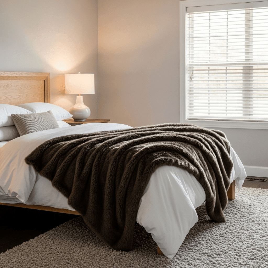 Layer the bed with oversized faux-fur blankets in shades of wolf grey or sable. This tactile element adds a layer of luxury and essential warmth, perfect for creating a “hygge” mountain lodge vibe.