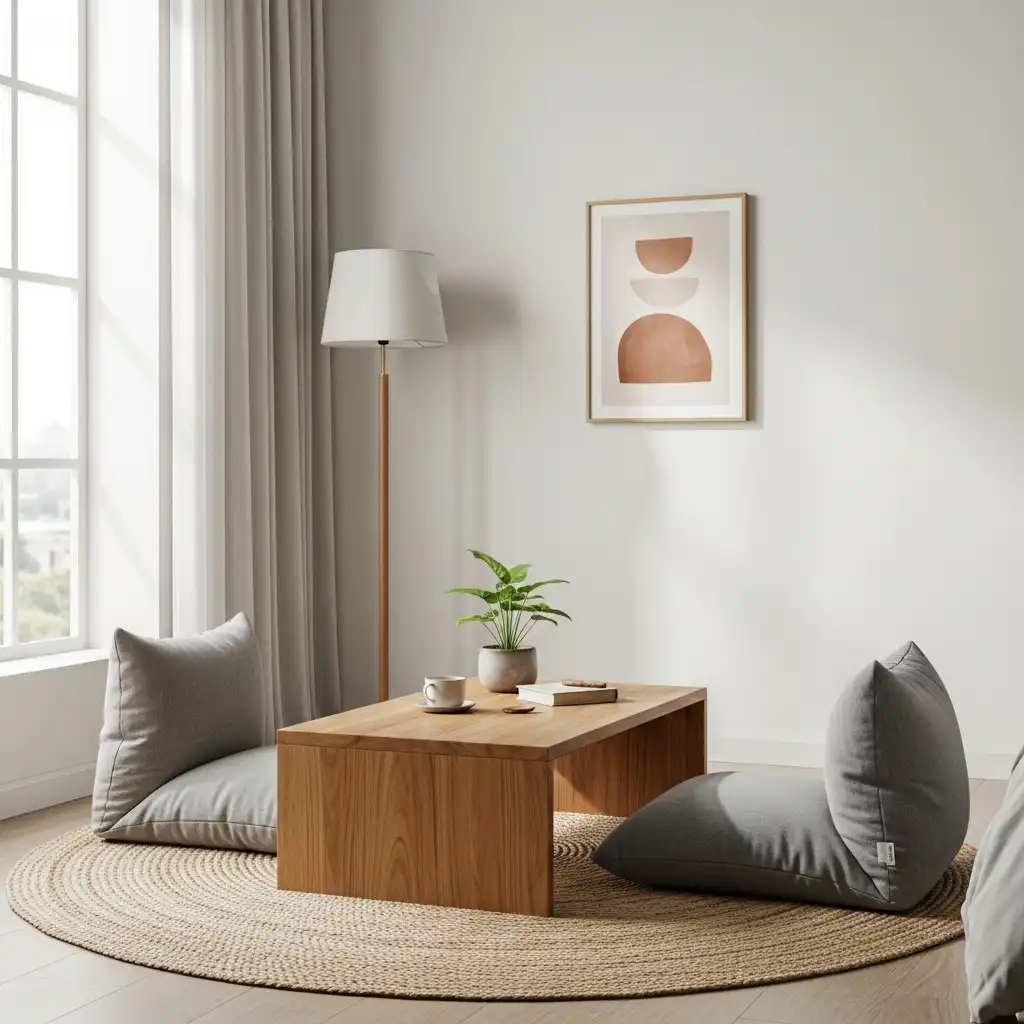 Keep the furniture low to the ground with floor cushions, a soft jute rug, and a low tea table. This setup prioritizes mental clarity and a peaceful, grounded atmosphere.