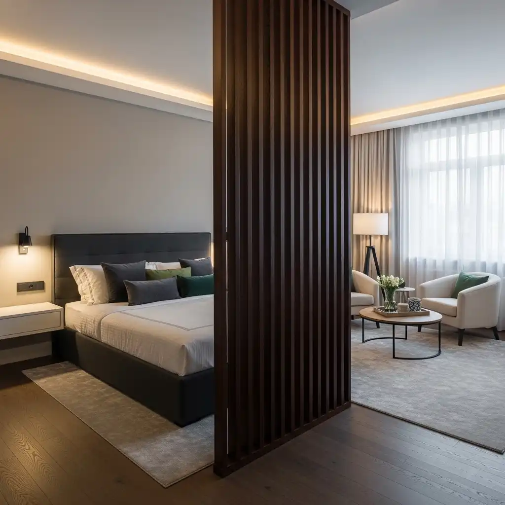 Use a decorative folding screen or a semi-transparent slatted wood partition to define the sitting area. This creates a sense of “destination” within the suite while maintaining an open feel.
