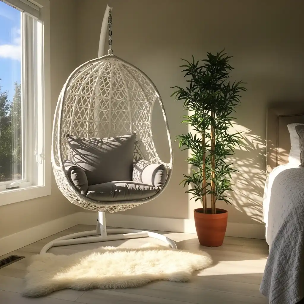 For a bohemian or contemporary touch, install a ceiling-mounted hanging chair. The gentle swaying motion adds a playful, stress-relieving element to the suite.