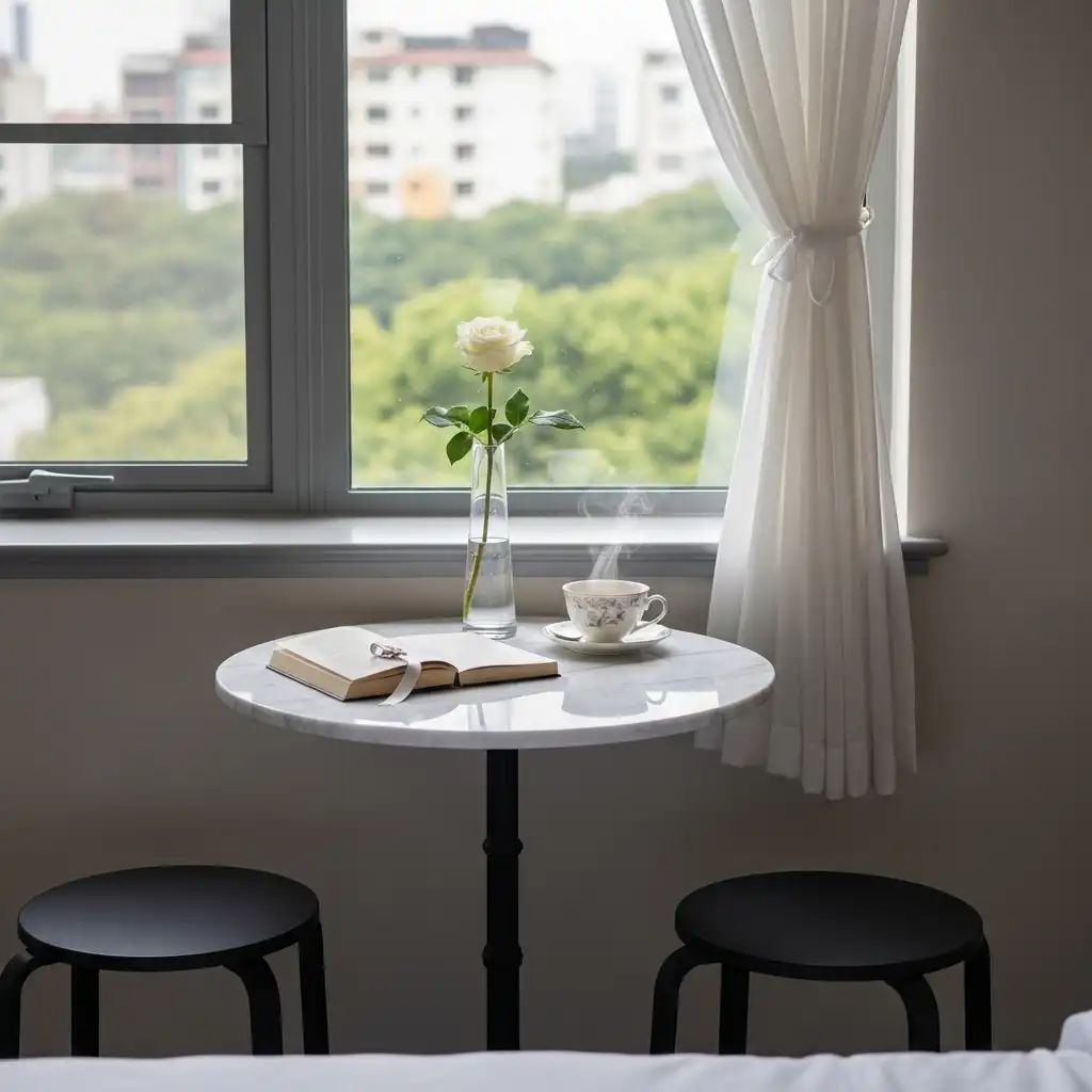 Set up a high-top bistro table and two sleek chairs near a balcony or large window. This “cafe-style” arrangement is perfect for starting the day with a view.