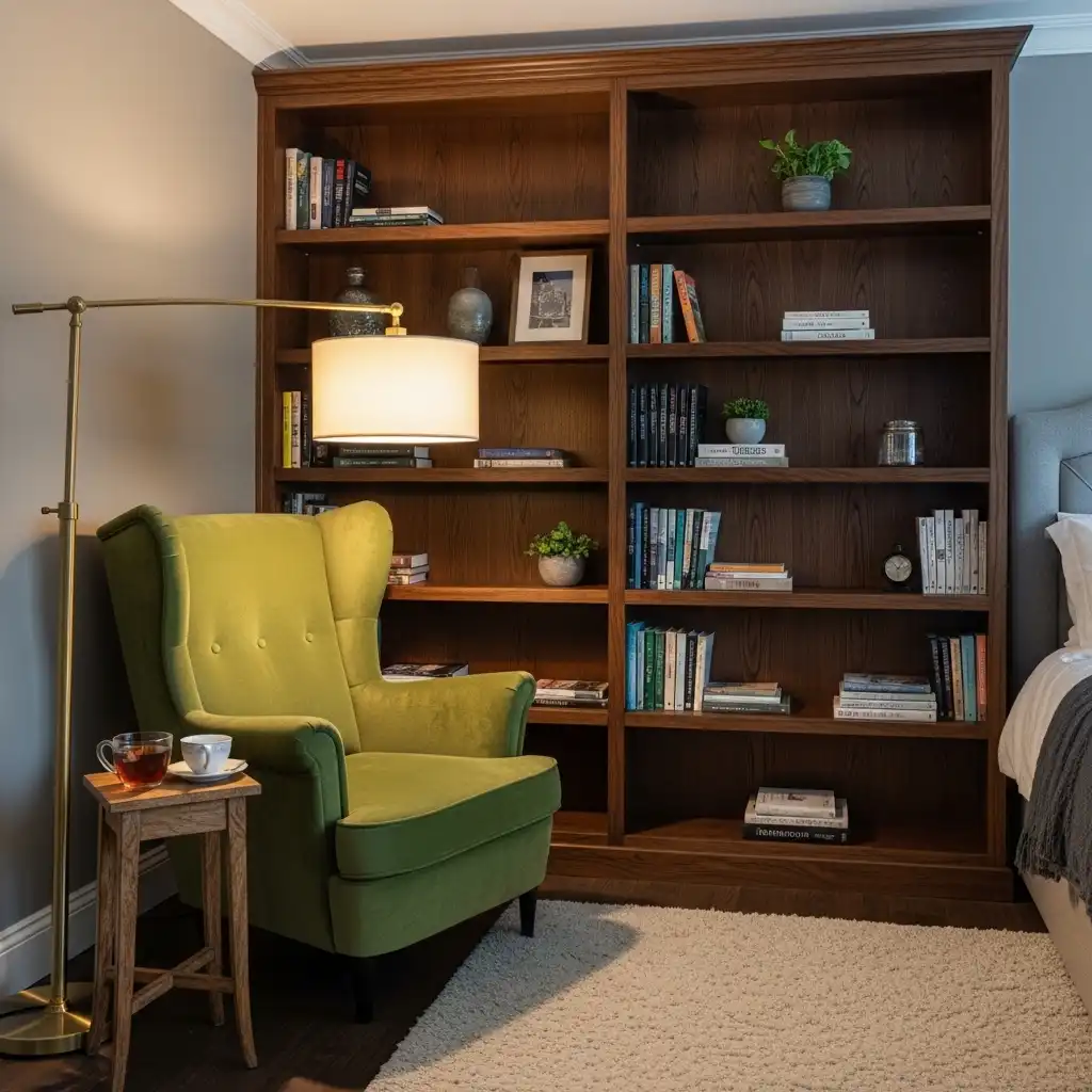 Transform a corner into a bibliophile’s retreat by installing floor-to-ceiling bookshelves around a single, high-backed wing chair and a dedicated reading lamp.