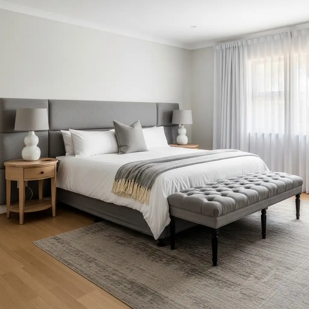 If space is narrow, place a deep, upholstered bench or a pair of low-profile ottomans at the foot of the bed. It’s an understated way to add seating without disrupting the room’s flow.