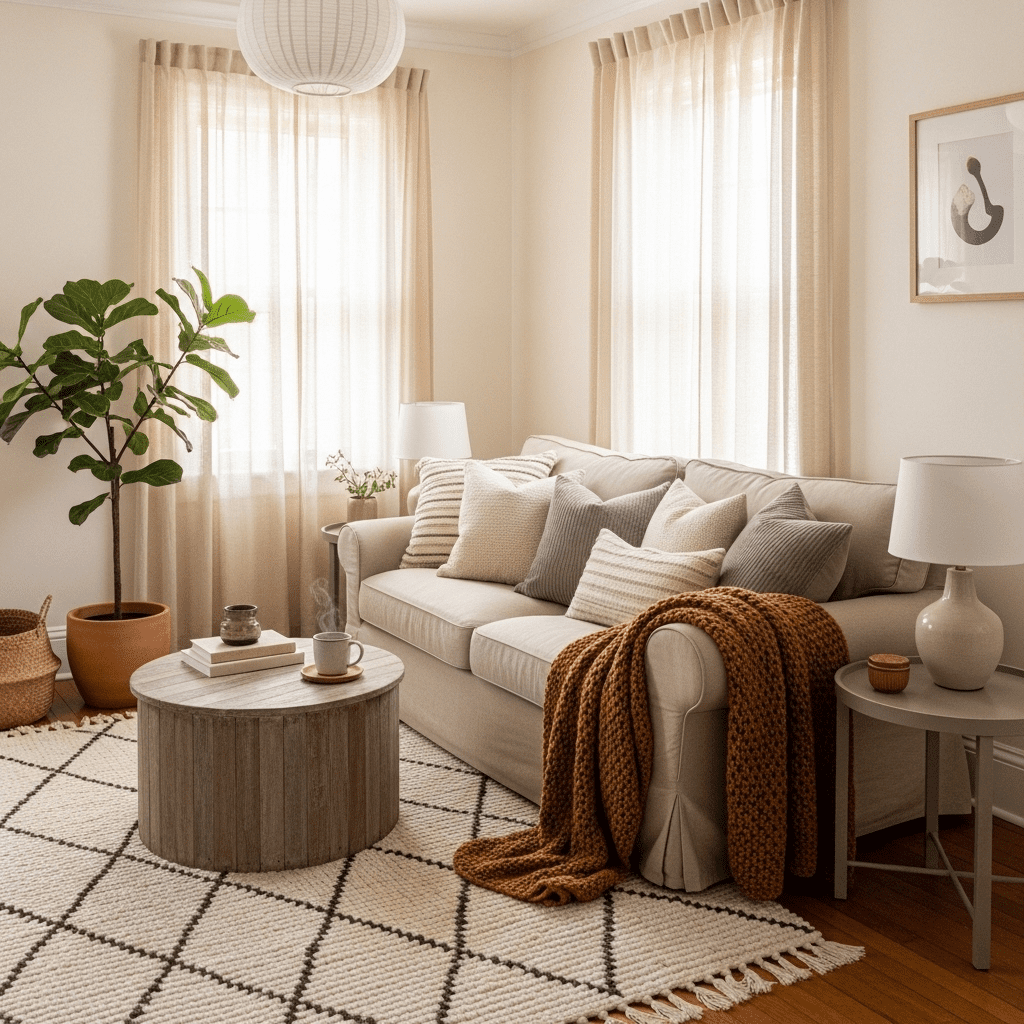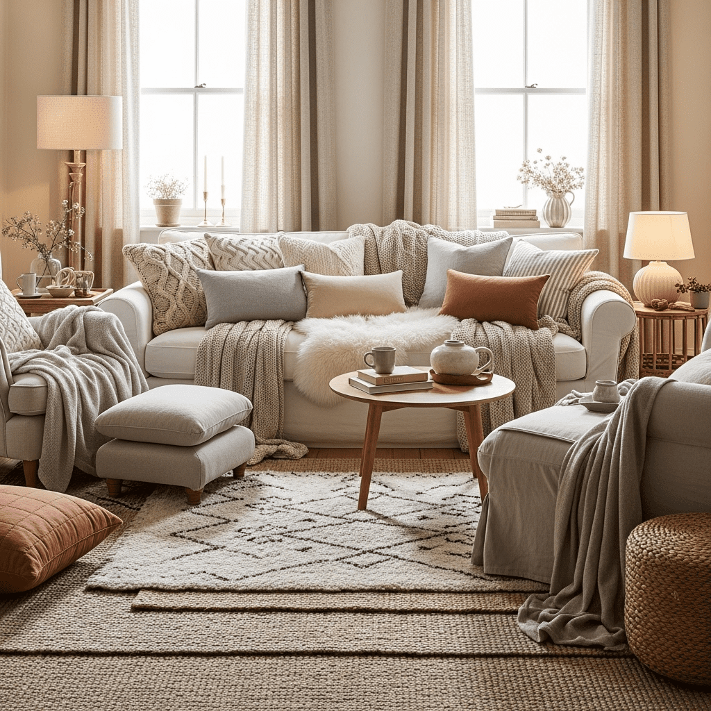 Winter Warmth: Add heavier throws, darker cushion colors, flannel textures, and maximum candles creating ultimate cold-weather coziness.