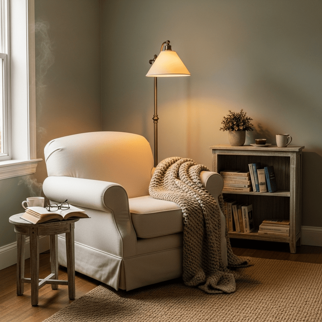 A dedicated cozy reading corner with oversized armchair, soft lighting, and small bookshelf creates intimate retreat within the living room.