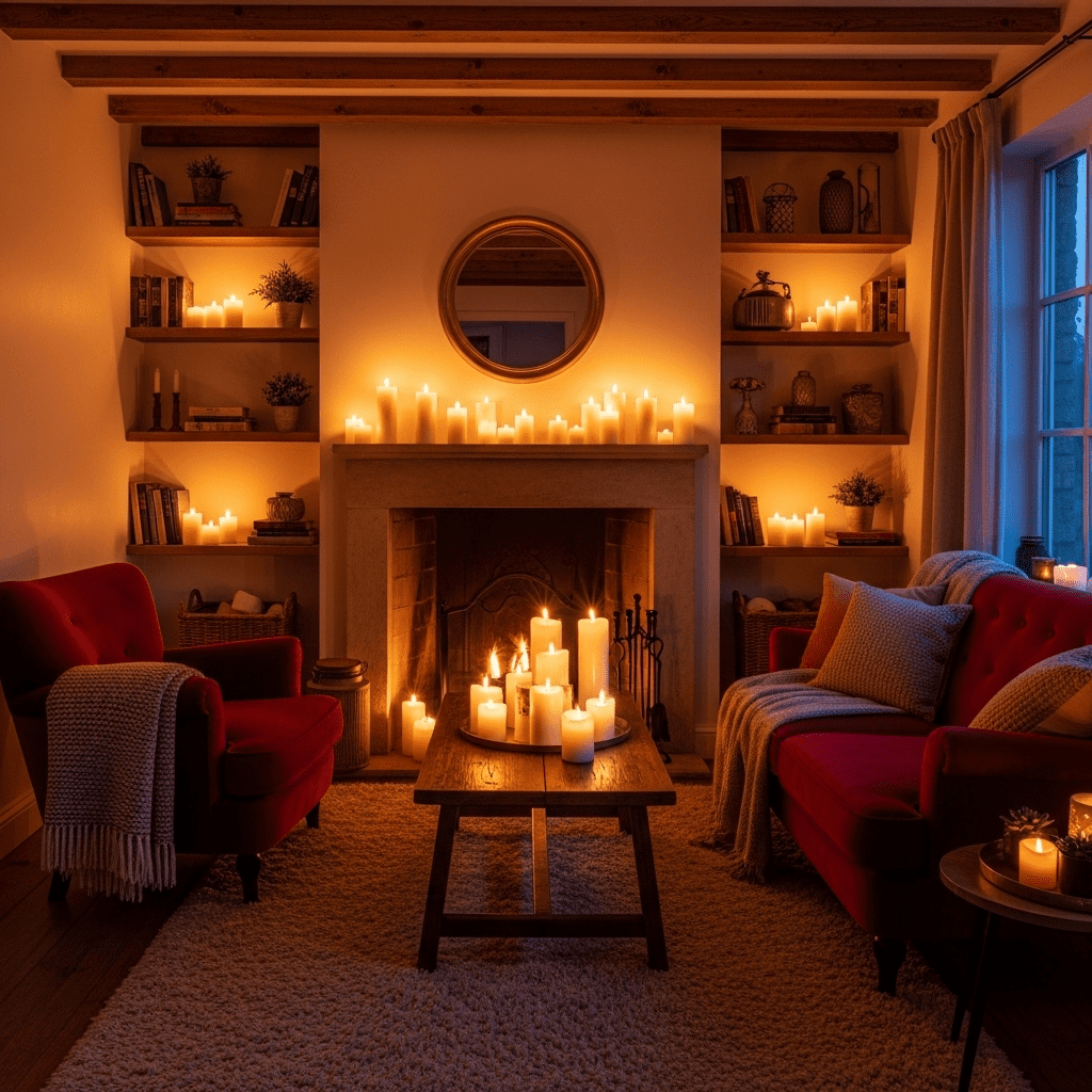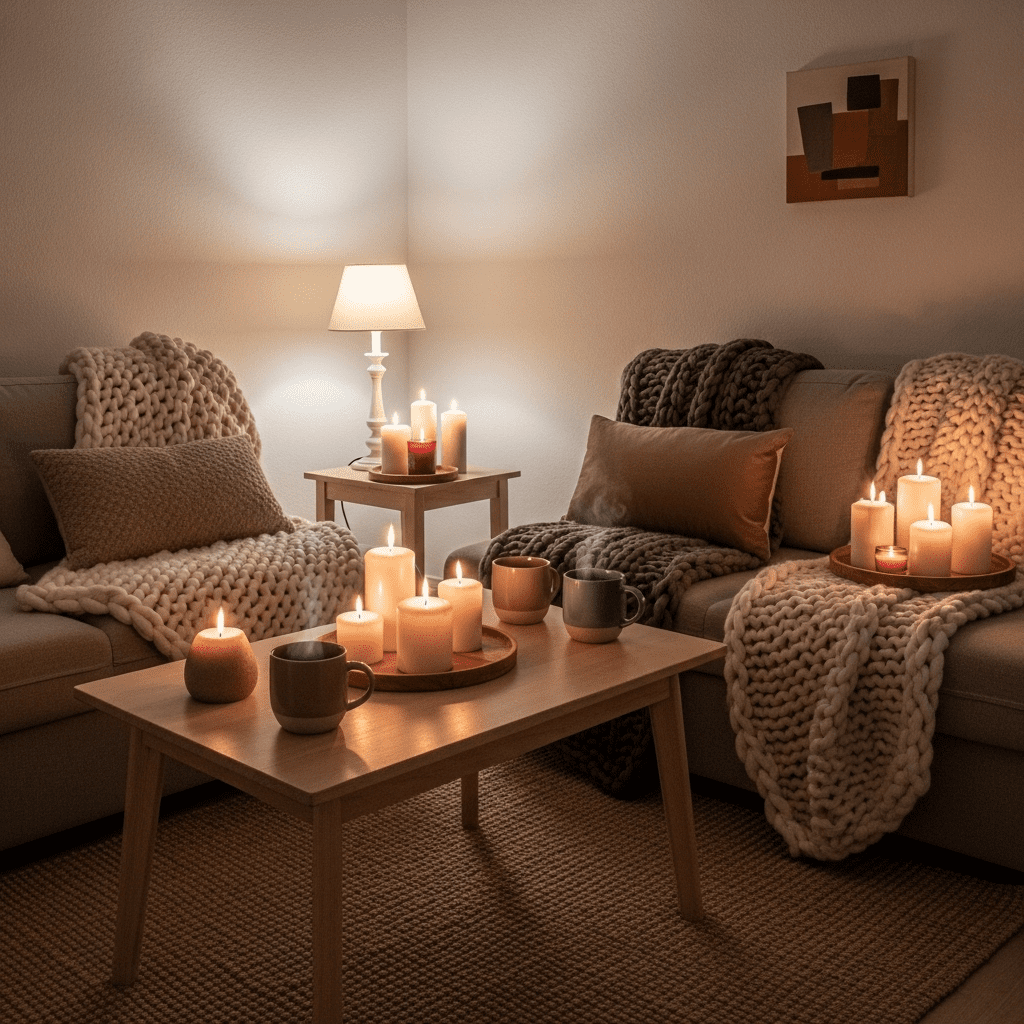 Candles and Lighting: Even basic spaces feel cozy with proper warm lighting and candles.