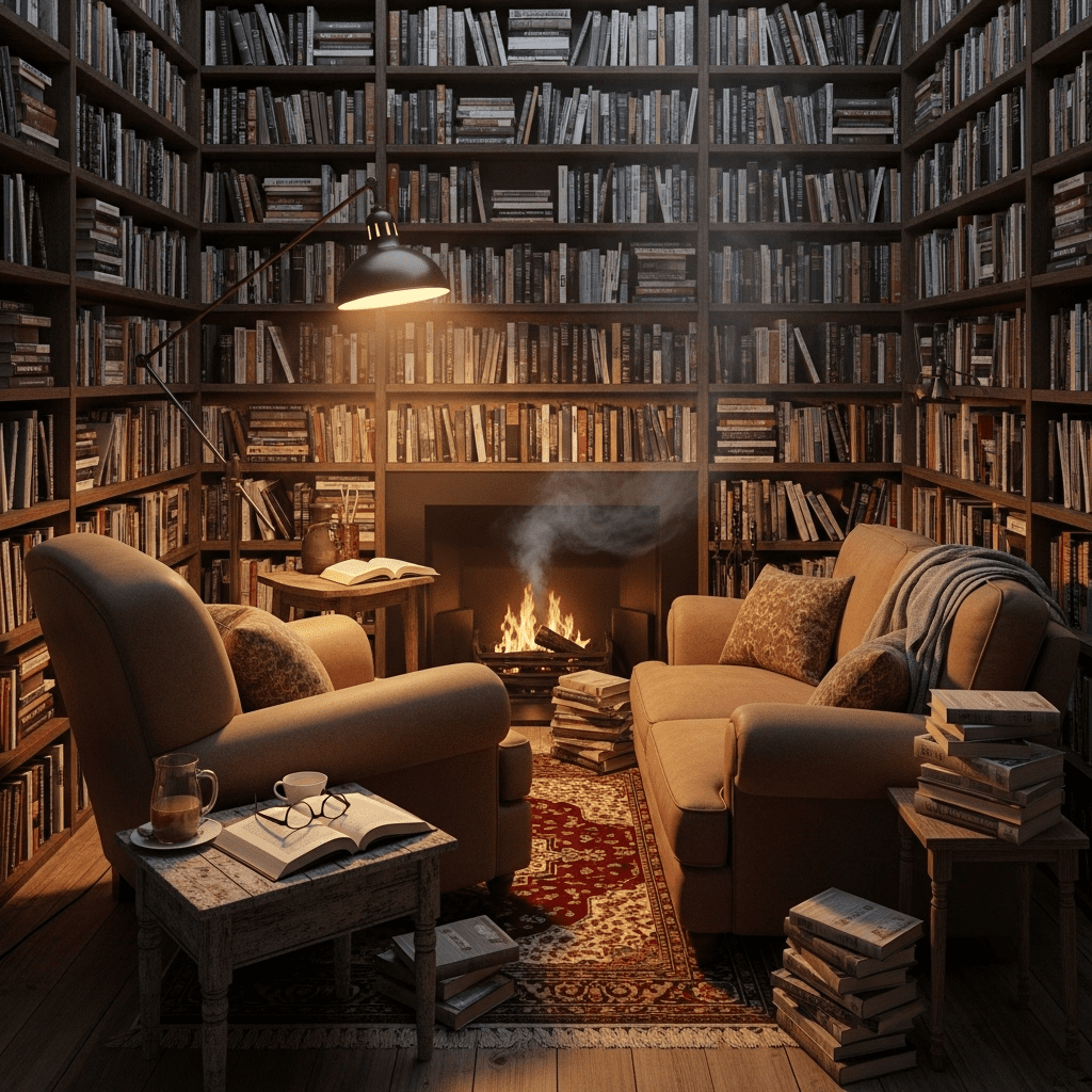 Floor-to-ceiling bookshelves surrounding seating create enclosed, intellectual warmth while providing practical storage in small spaces.