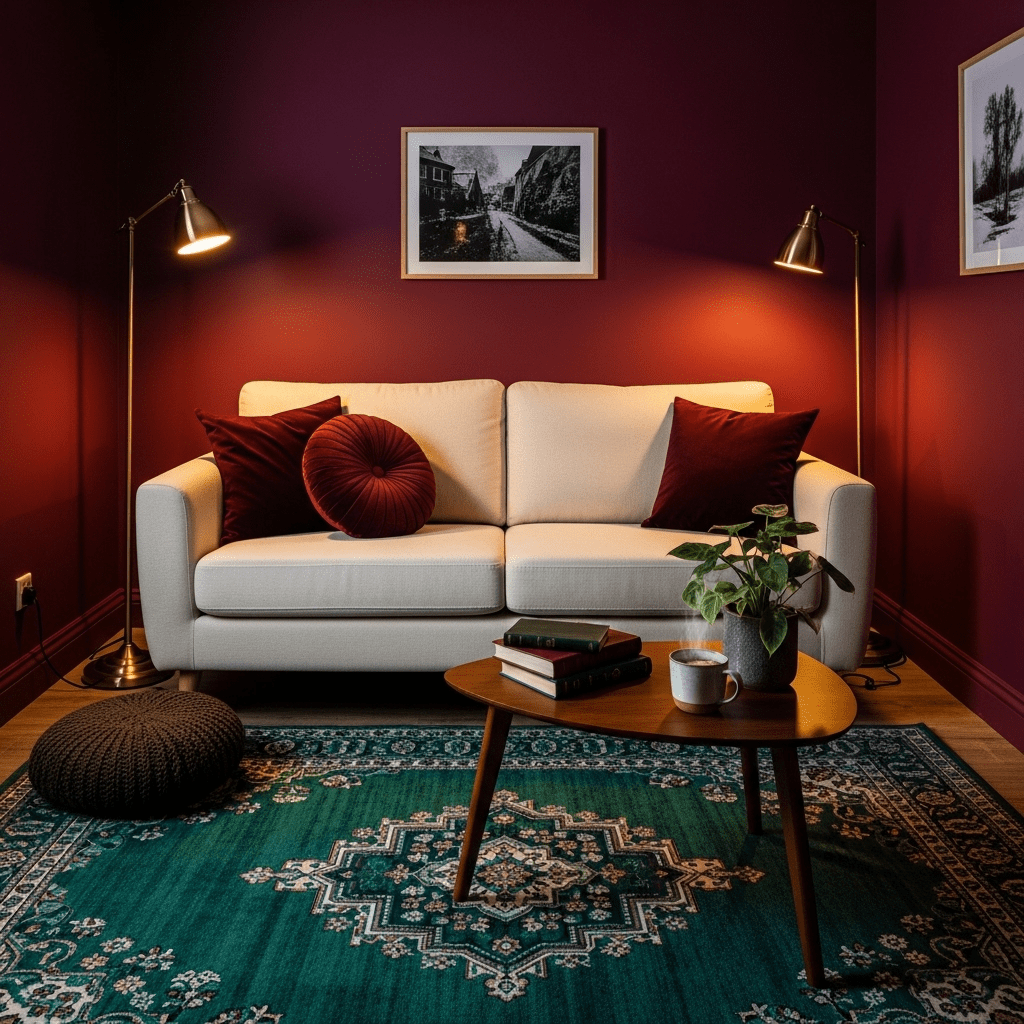 Rich burgundy, forest green, or navy walls create cocooning intimacy, wrapping small rooms in warm, enveloping color.