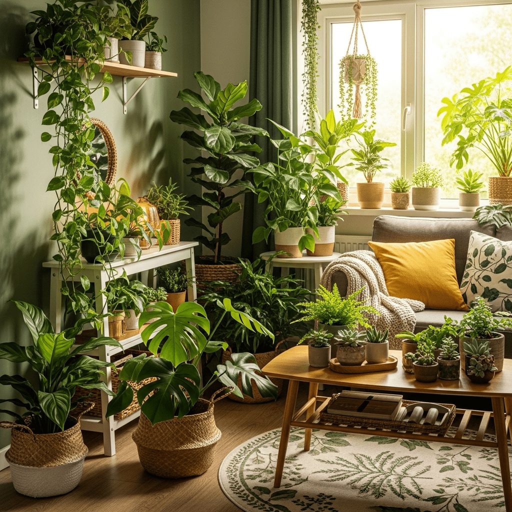 Multiple houseplants throughout small living rooms add life, oxygen, and organic warmth creating cozy, nature-connected spaces.