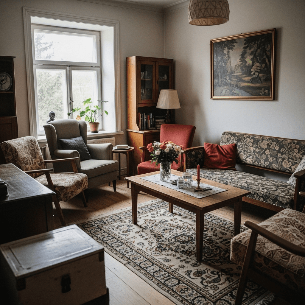 Mixed vintage furniture, inherited pieces, and flea market finds create the collected-over-time warmth that new furniture cannot replicate.