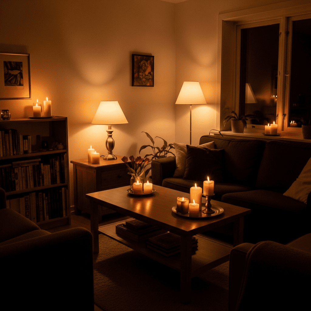 Multiple Sources: Layer 4-6 light sources—table lamps, floor lamps, candles—creating dimensional warmth rather than single flat overhead illumination.