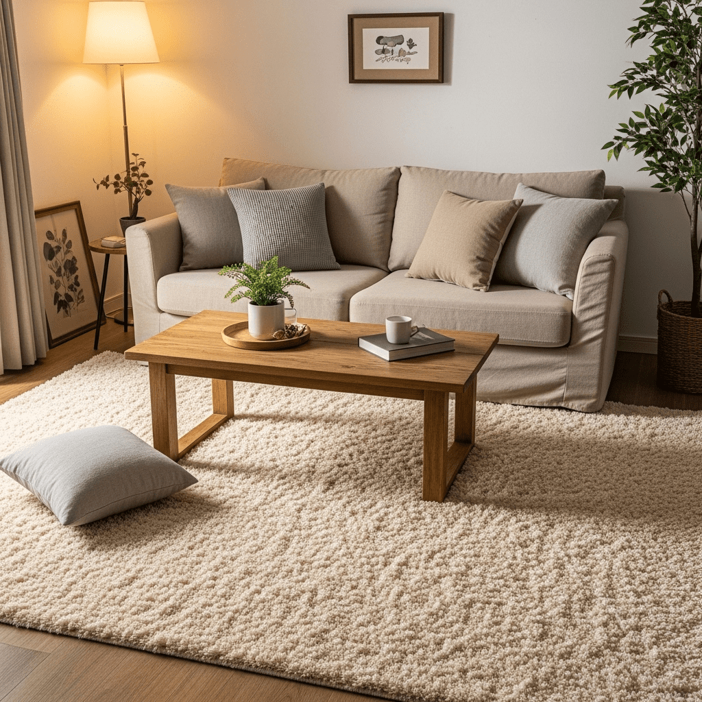 Large, thick area rug adds warmth underfoot while defining seating area, contributing essential tactile coziness to small living rooms.