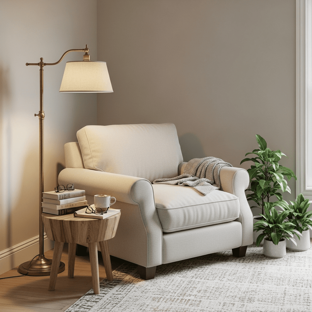 Dedicated cozy corner with oversized armchair, soft reading lamp, small side table, and nearby bookshelf creates intimate retreat within the living room.