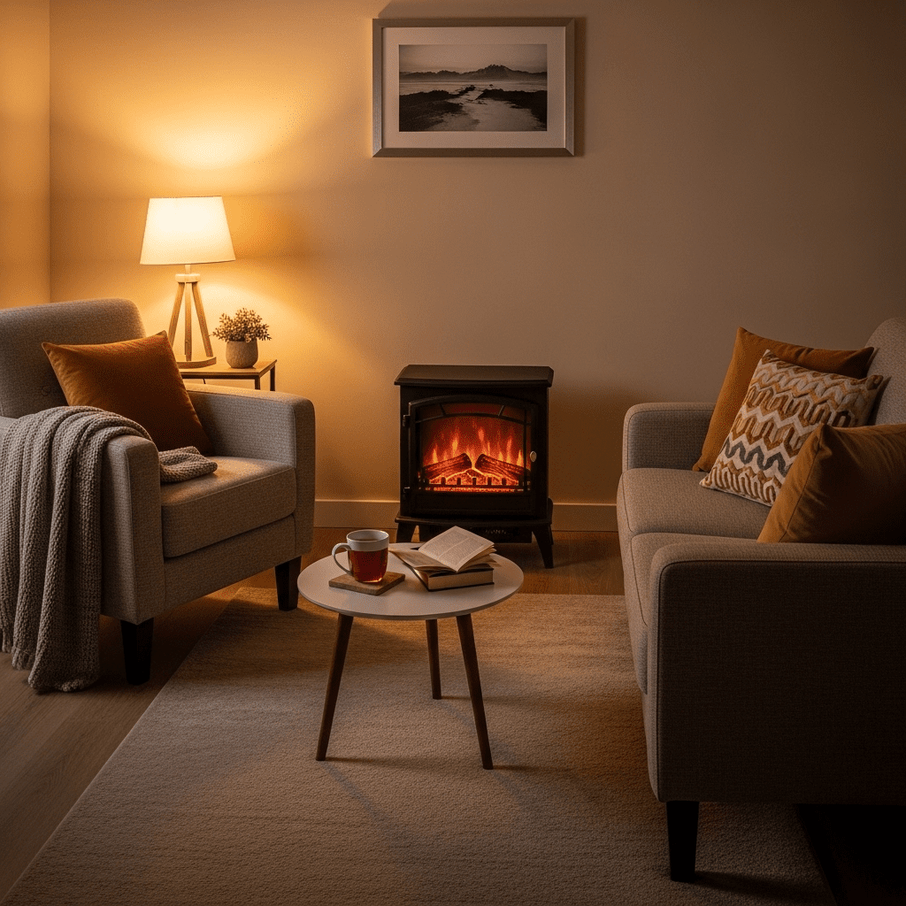 Small electric fireplace or portable heater provides both literal warmth and visual cozy focal point around which seating naturally gathers.