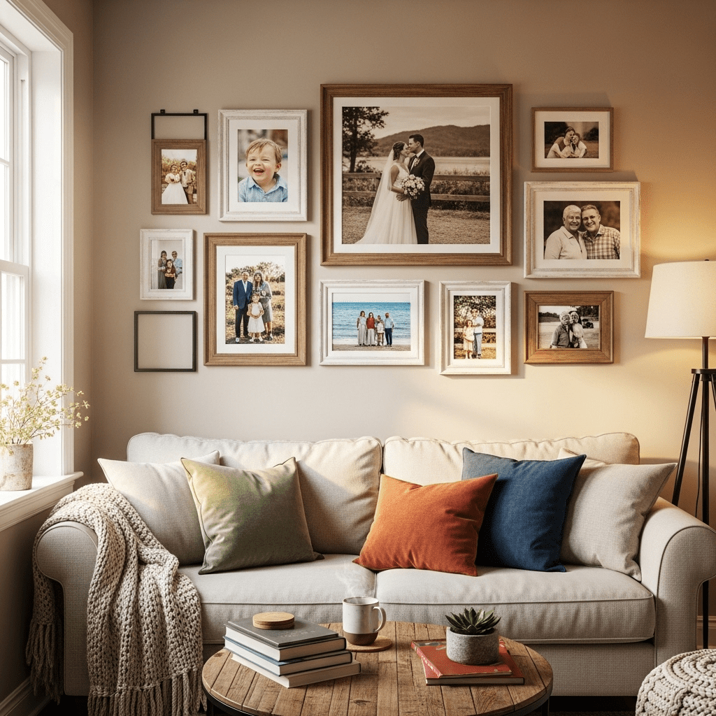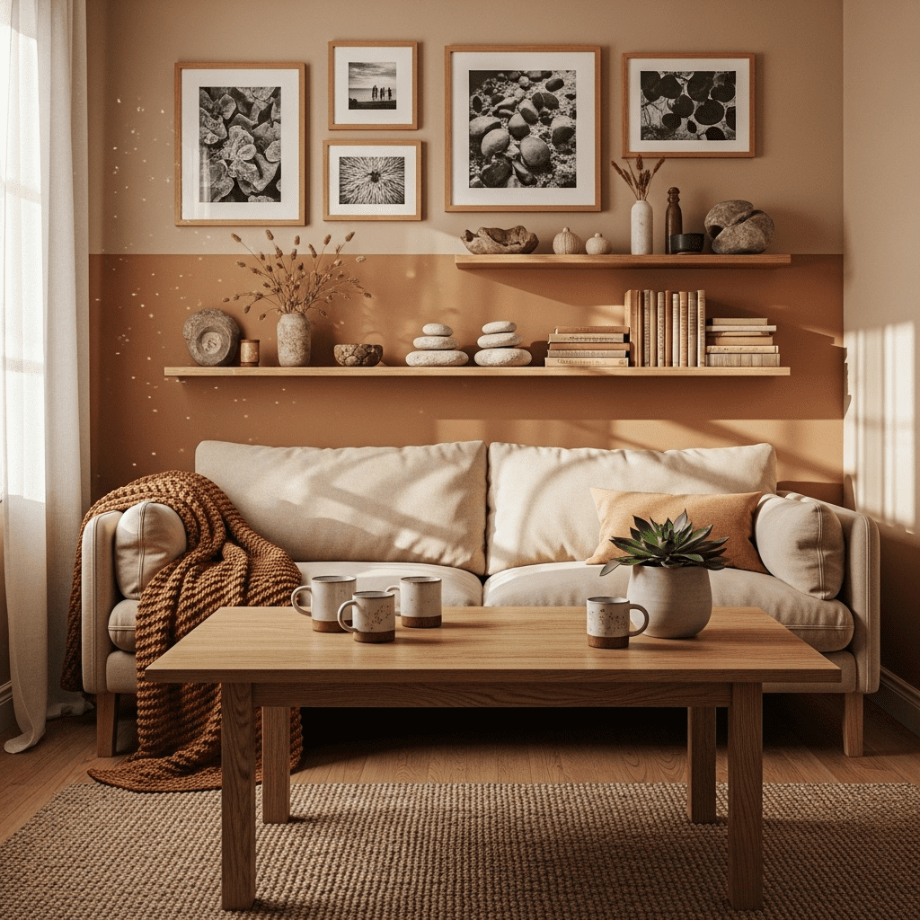 Wooden coffee table, shelving, or picture frames adds organic warmth that manufactured materials cannot replicate in creating cozy atmospheres.