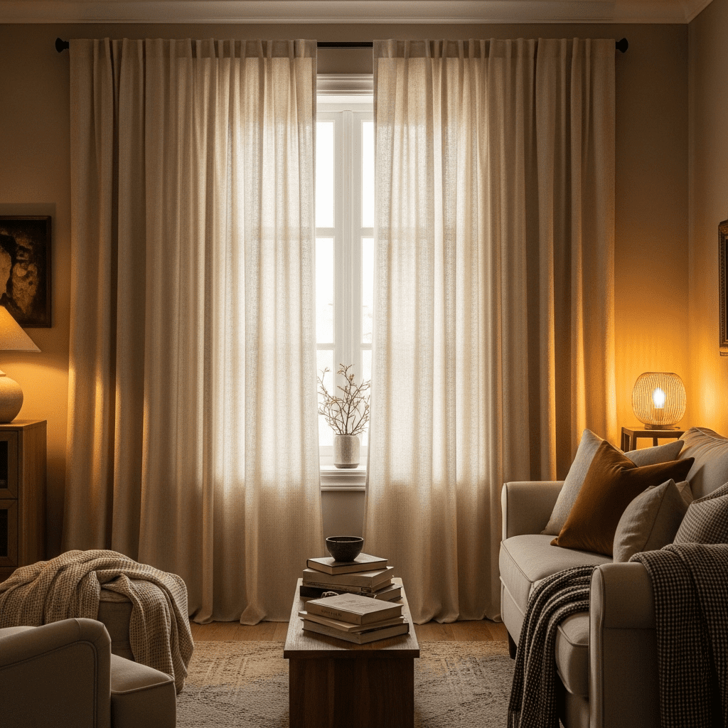 Heavy, lined curtains in warm fabrics add softness, improve insulation, reduce echo, and frame windows creating cozy, enclosed feelings.