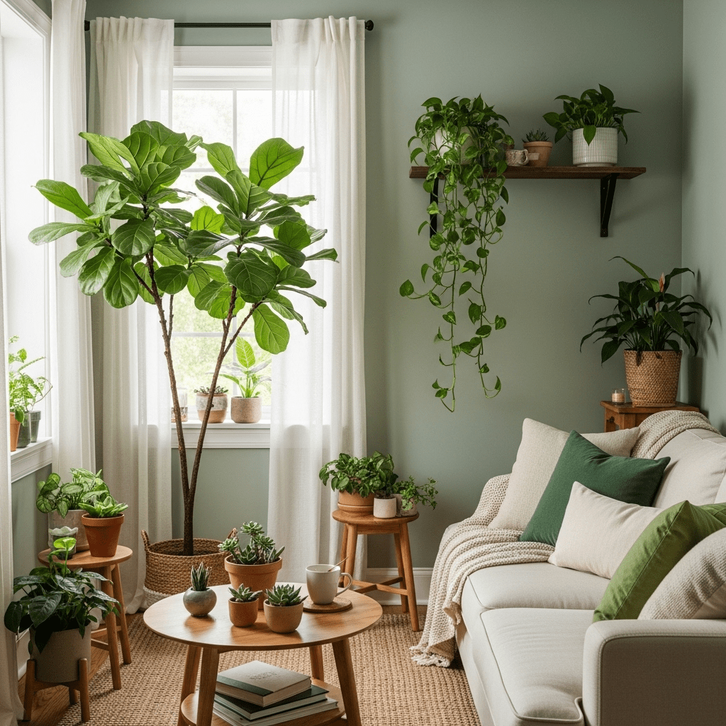 Several houseplants throughout small living room add organic warmth, improve air quality, and create living, breathing cozy environments.